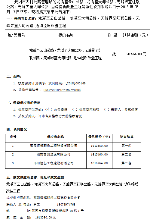 龍溪至云山公路、龍溪至大甸公路、無峰界至紅聯(lián)公路、無峰界至大甸公路 邊溝提質(zhì)改造工程競爭性談判成交結(jié)果公告