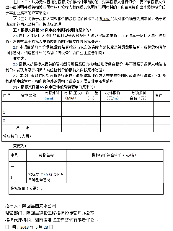 隆回縣自來水公司周旺鎮斜嶺供水工程和桃山供水工程 自來水管材采購項目招標文件修改及延期公告