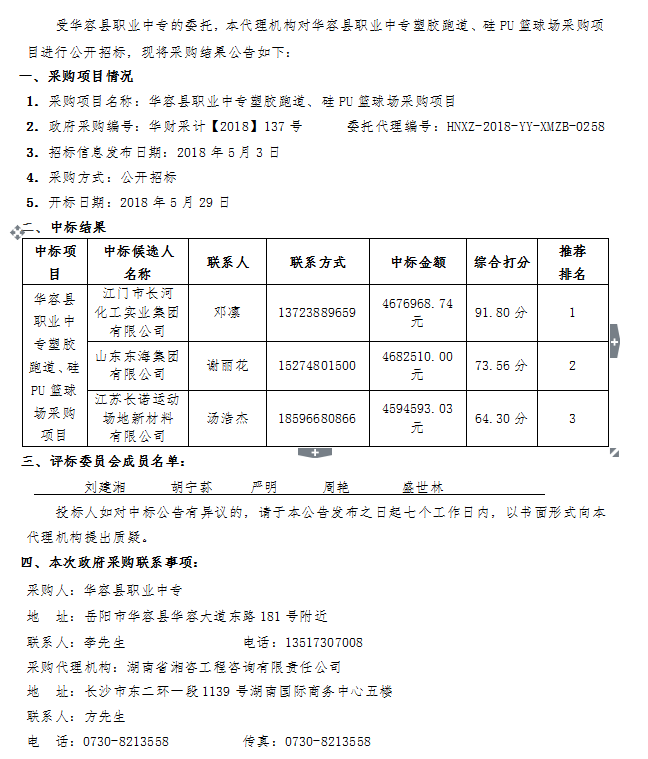 華容縣職業中專塑膠跑道、硅PU籃球場采購項目公開招標中標公告