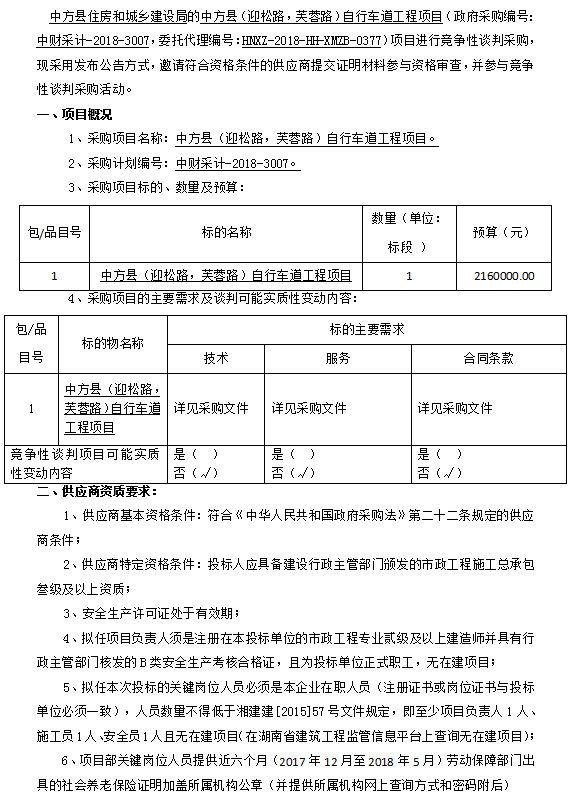 中方縣(迎松路,芙蓉路)自行車道工程項目競爭性談判公告