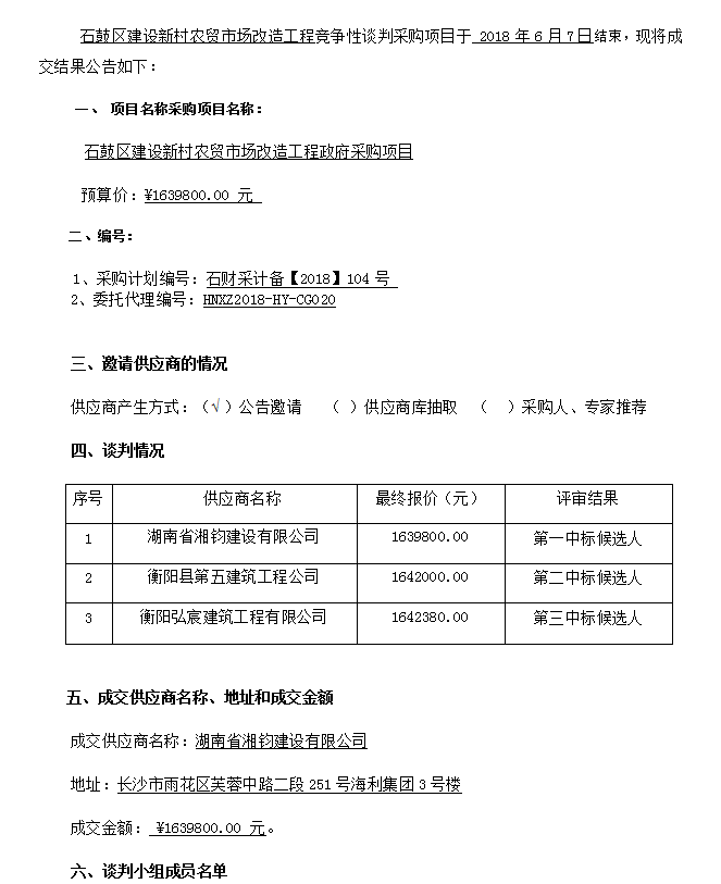 石鼓區建設新村農貿市場改造工程政府采購項目 競爭性談判成交結果公告