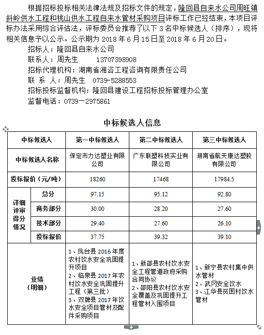 隆回縣自來水公司周旺鎮斜嶺供水工程和桃山供水工程自來水管材采購項目招標投標信息公示表