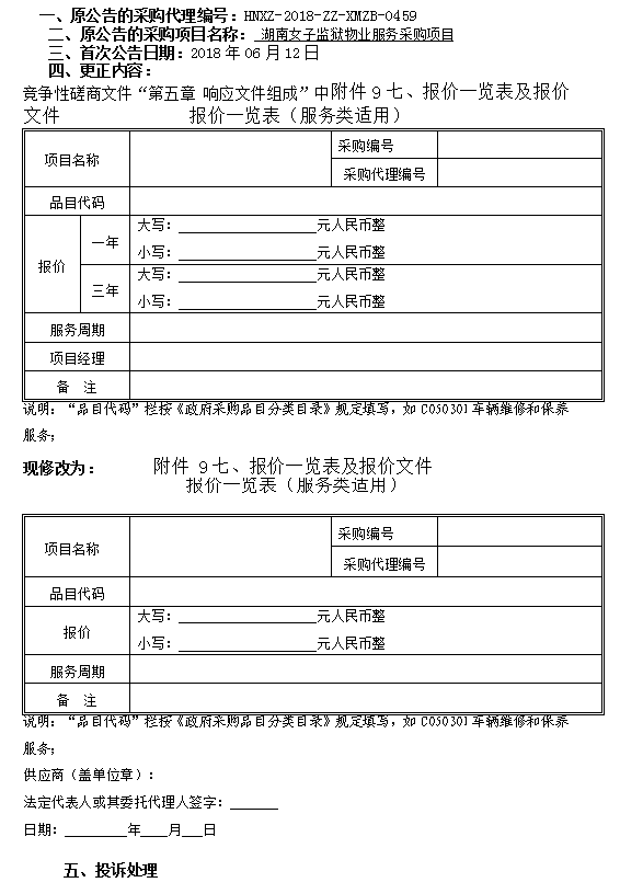 湖南女子監(jiān)獄物業(yè)服務(wù)采購項目競爭性磋商更正公告
