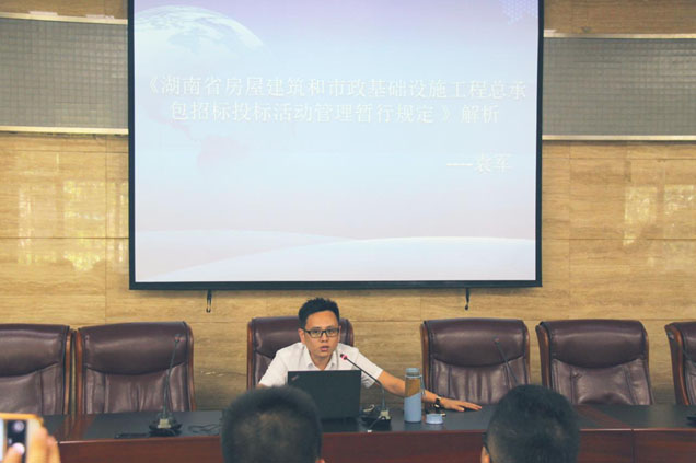 湘咨訊(陳劍光) 7 月 21 日,我公司在二樓組織召開了《湖南省房:建筑和市政基礎設施工程總承包招標投標活動管理暫行規定》湘建監督【2017】76號文專題學習會(以下簡稱《暫行規定》)。會議原文學習了《暫行規定》,副總經理袁軍主要從 27 條規定來講授,每條規定進行了詳盡的解析。