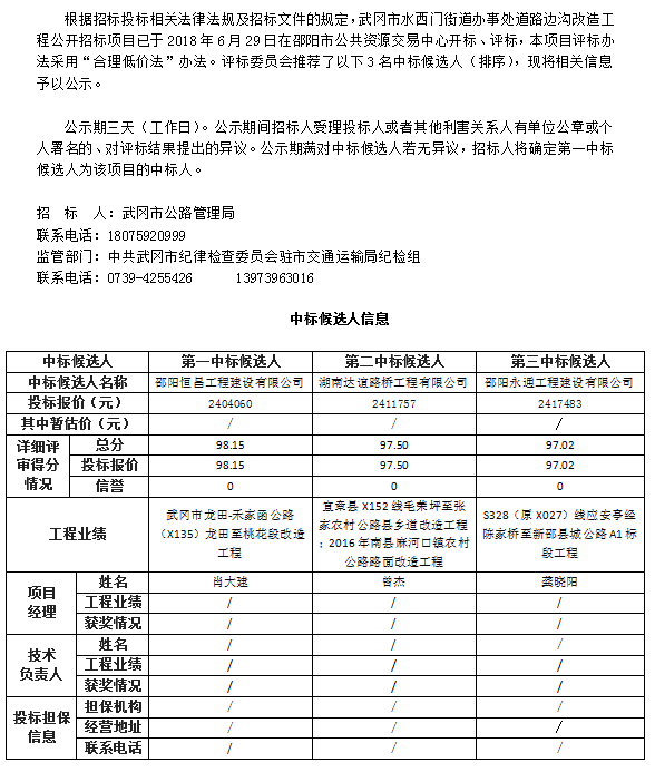 武岡市水西門街道辦事處道路邊溝改造工程 中標候選人公示