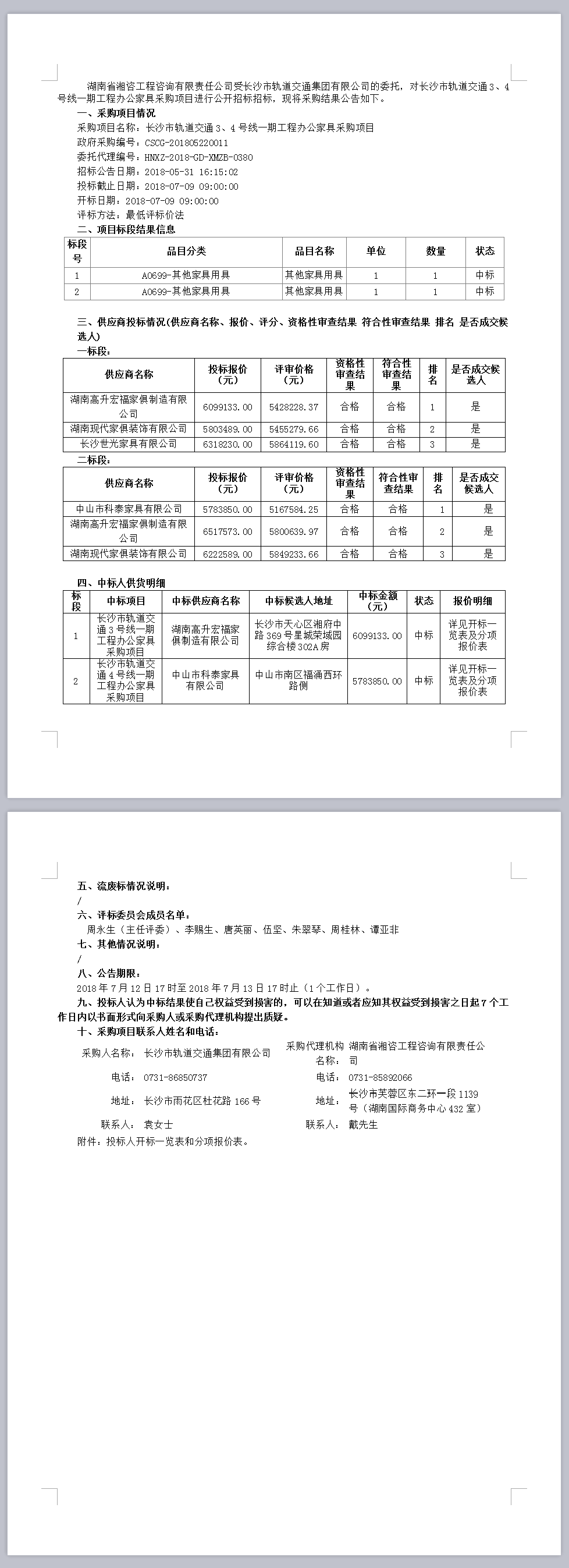 長沙市軌道交通集團有限公司長沙市軌道交通3、4號線一期工程辦公家具采購項目結果公告