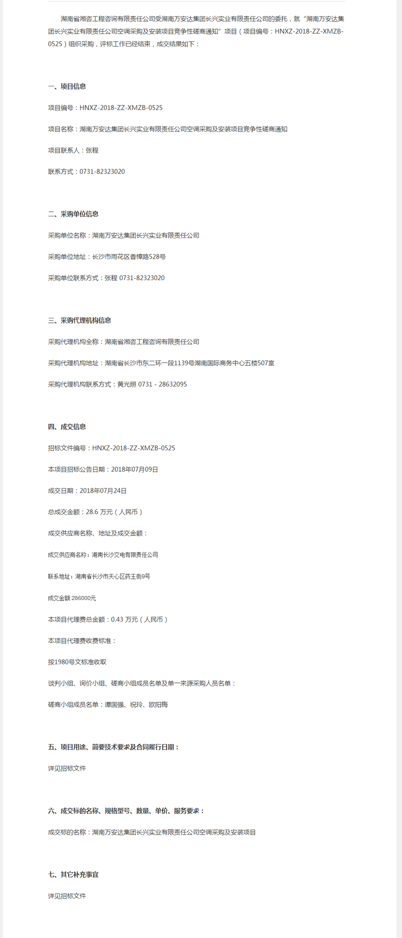 湖南萬安達集團長興實業(yè)有限責任公司空調采購及安裝項目競爭性磋商通知成交公告