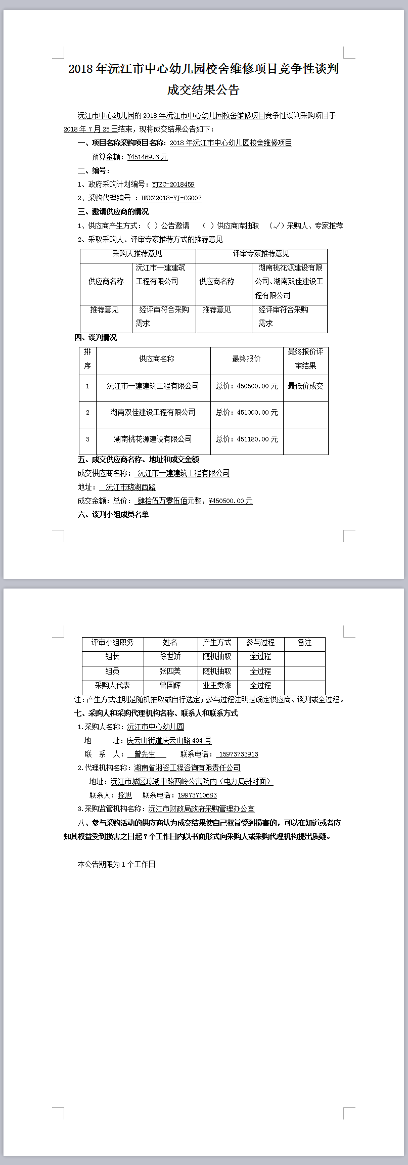 2018年沅江市中心幼兒園校舍維修項目競爭性談判成交結果公告