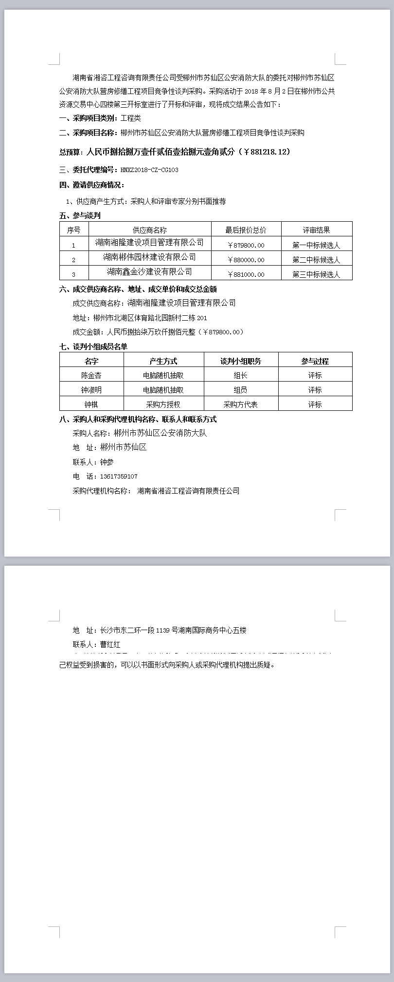 郴州市蘇仙區(qū)公安消防大隊營房修繕工程項目競爭性談判采購成交公告
