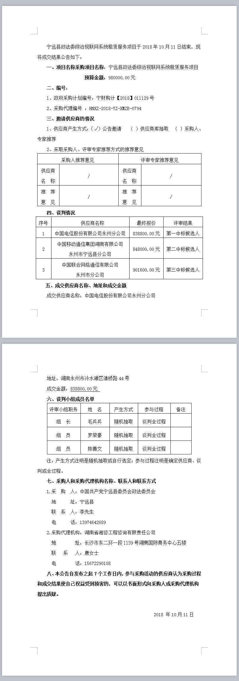 寧遠縣政法委綜治視聯網系統租賃服務項目 競爭性談判成交結果公告