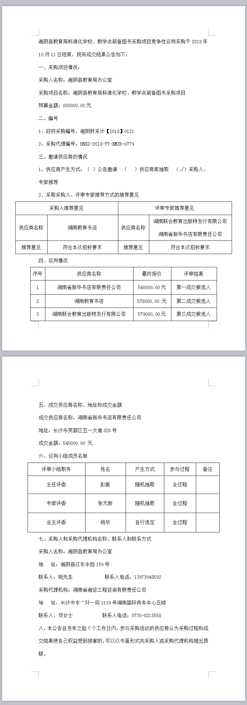 湘陰縣教育局標(biāo)準(zhǔn)化學(xué)校、教學(xué)點裝備圖書采購項目競爭性談判成交結(jié)果公告
