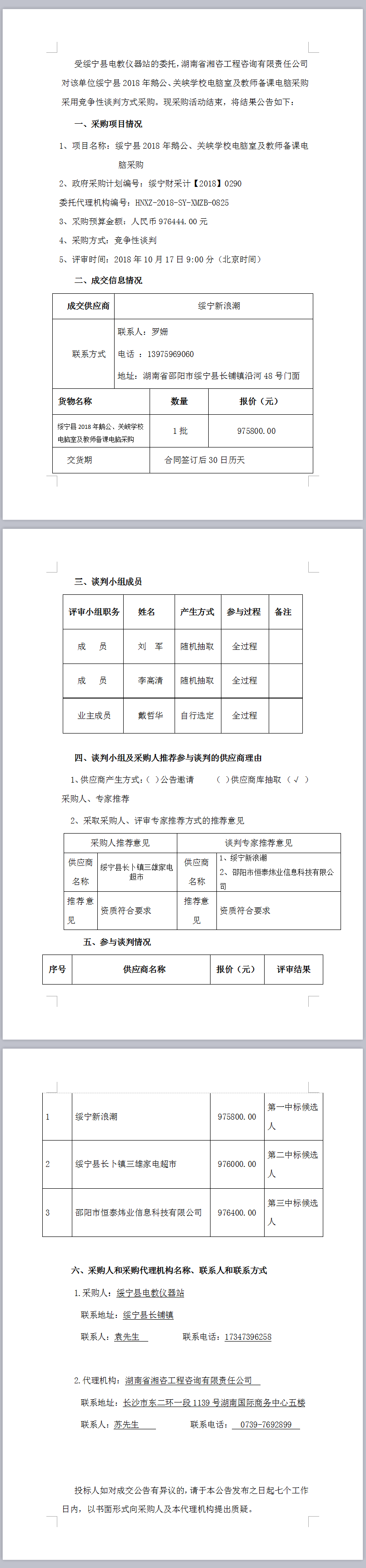 綏寧縣2018年鵝公、關峽學校電腦室及教師備課電腦采購談判成交公告