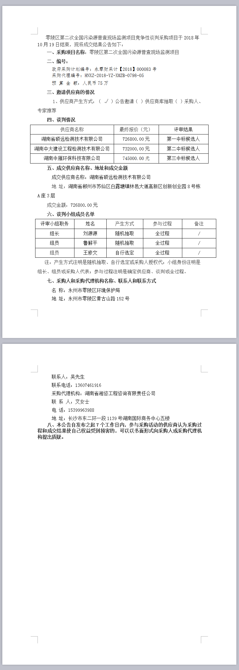零陵區第二次全國污染源普查現場監測項目競爭性談判成交公告
