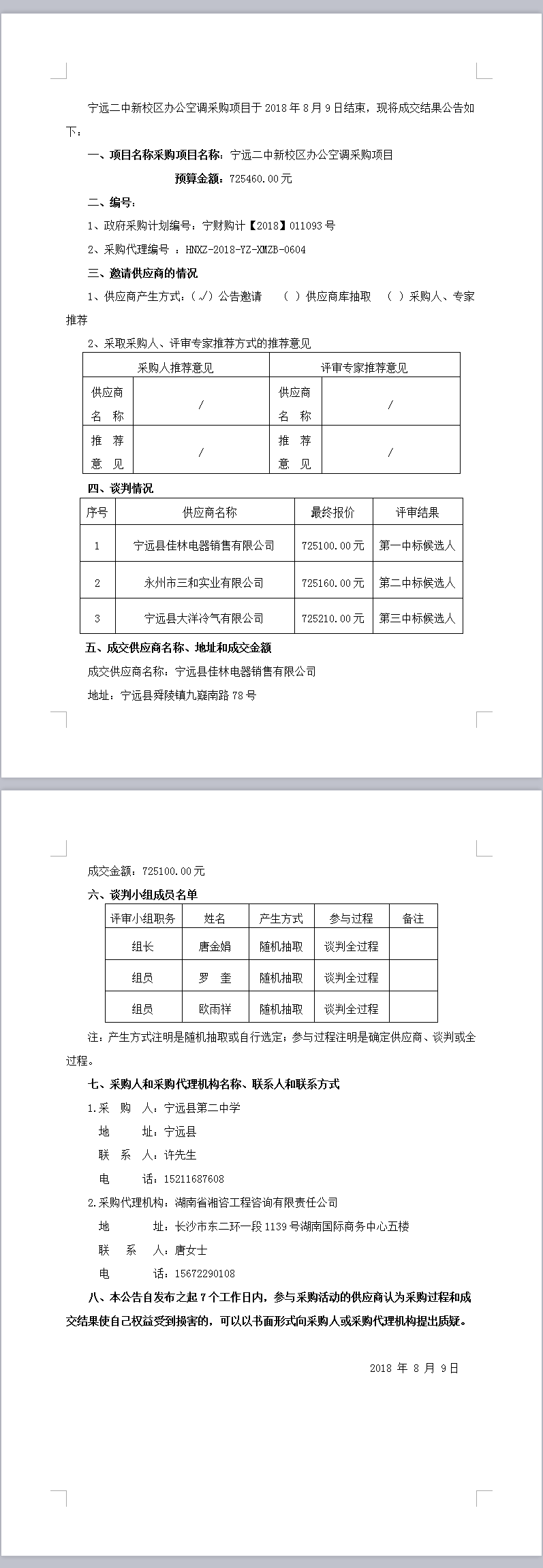 寧遠二中新校區辦公空調采購項目競爭性談判成交結果公告
