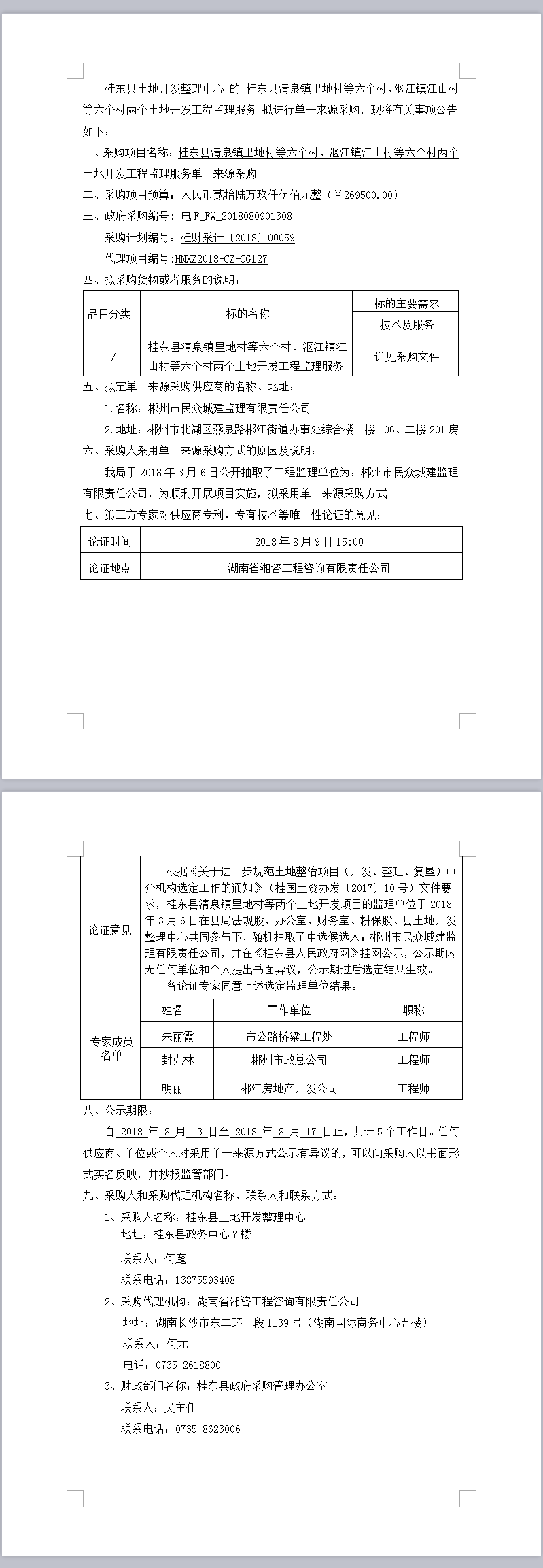 桂東縣清泉鎮里地村等六個村、漚江鎮江山村等六個村兩個土地開發工程監理服務單一來源采購公示