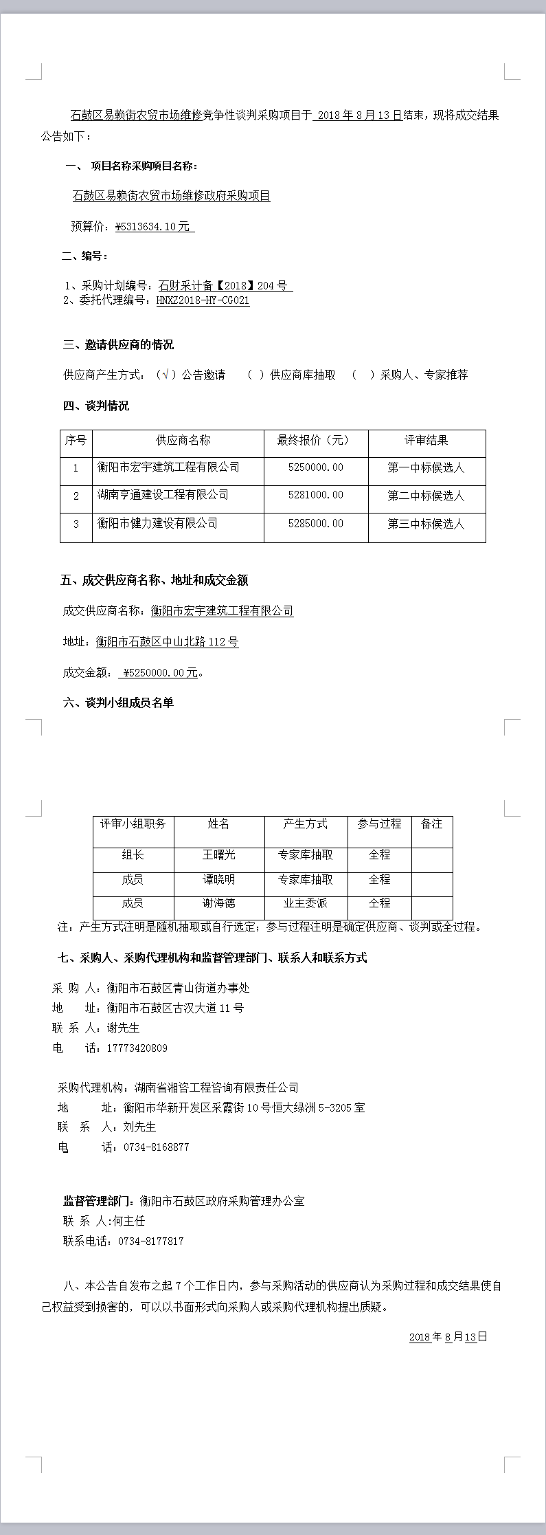 石鼓區易賴街農貿市場維修政府采購項目競爭性談判成交結果公告