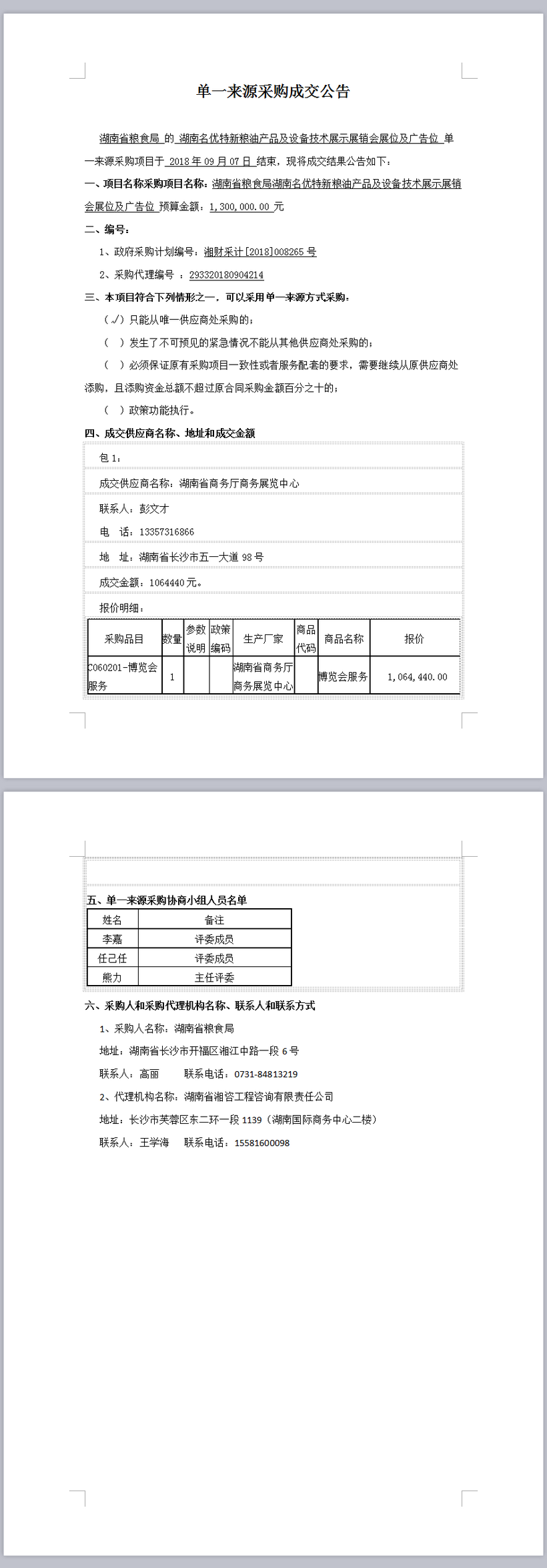 湖南省糧食局湖南名優(yōu)特新糧油產(chǎn)品及設(shè)備技術(shù)展示展銷會(huì)展位及廣告位單一來源采購(gòu)成交公告