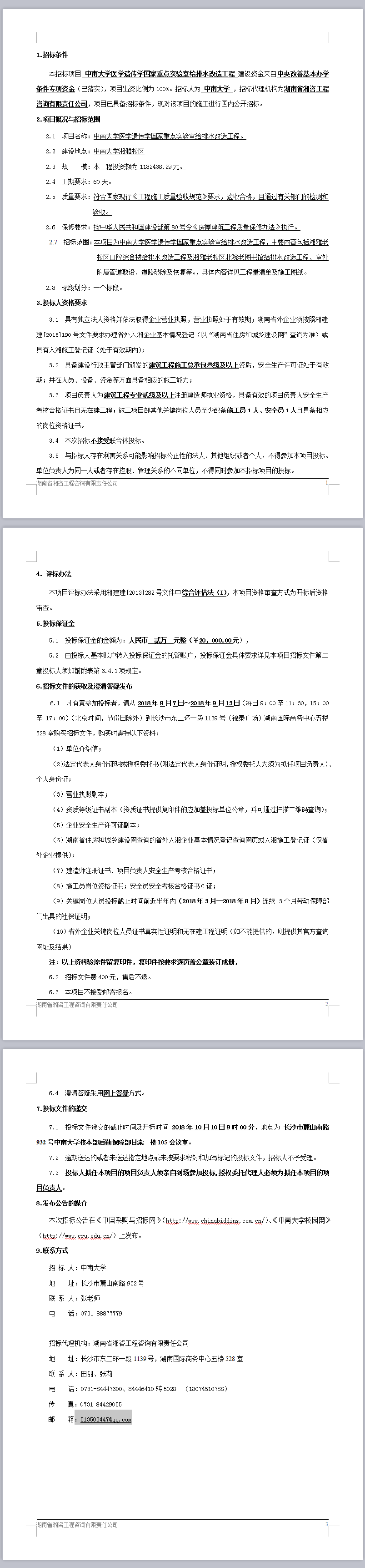 中南大學醫學遺傳學國家重點實驗室給排水改造工程招標公告