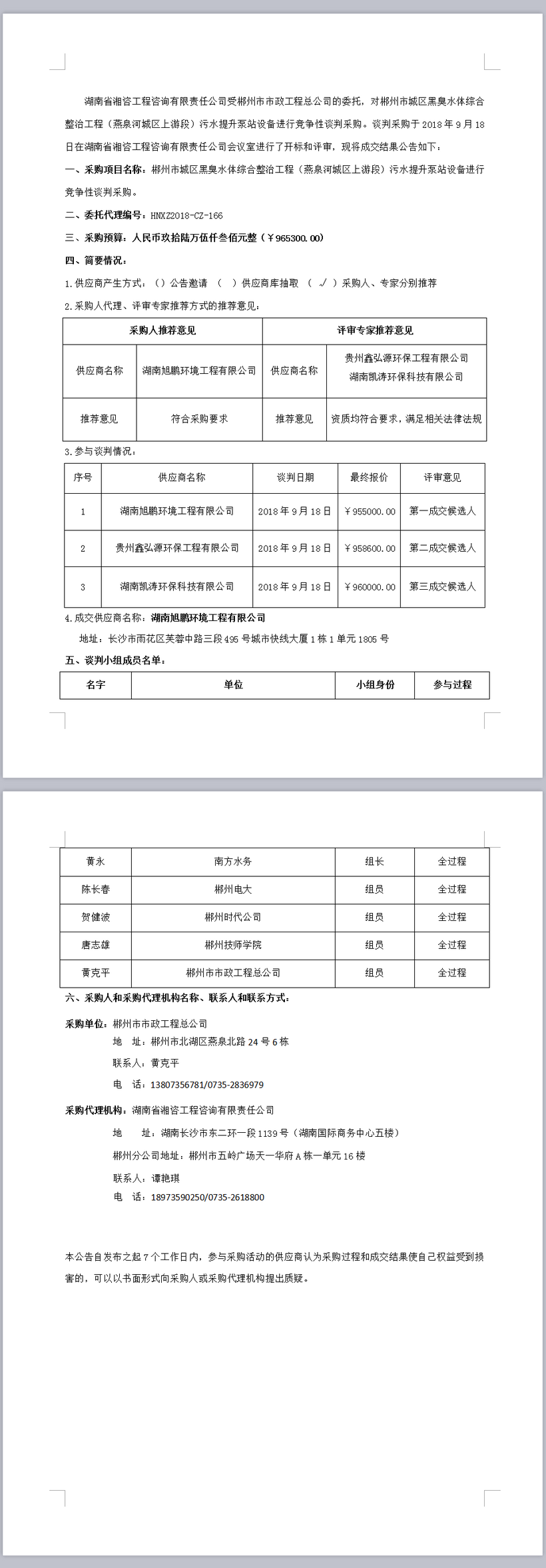郴州市城區黑臭水體綜合整治工程(燕泉河城區上游段)污水提升泵站設備競爭性談判采購成交公告