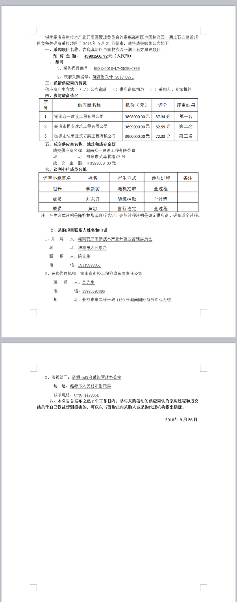 婁底高新區中國物流園一期土石方建設項目競爭性磋商成交結果公告