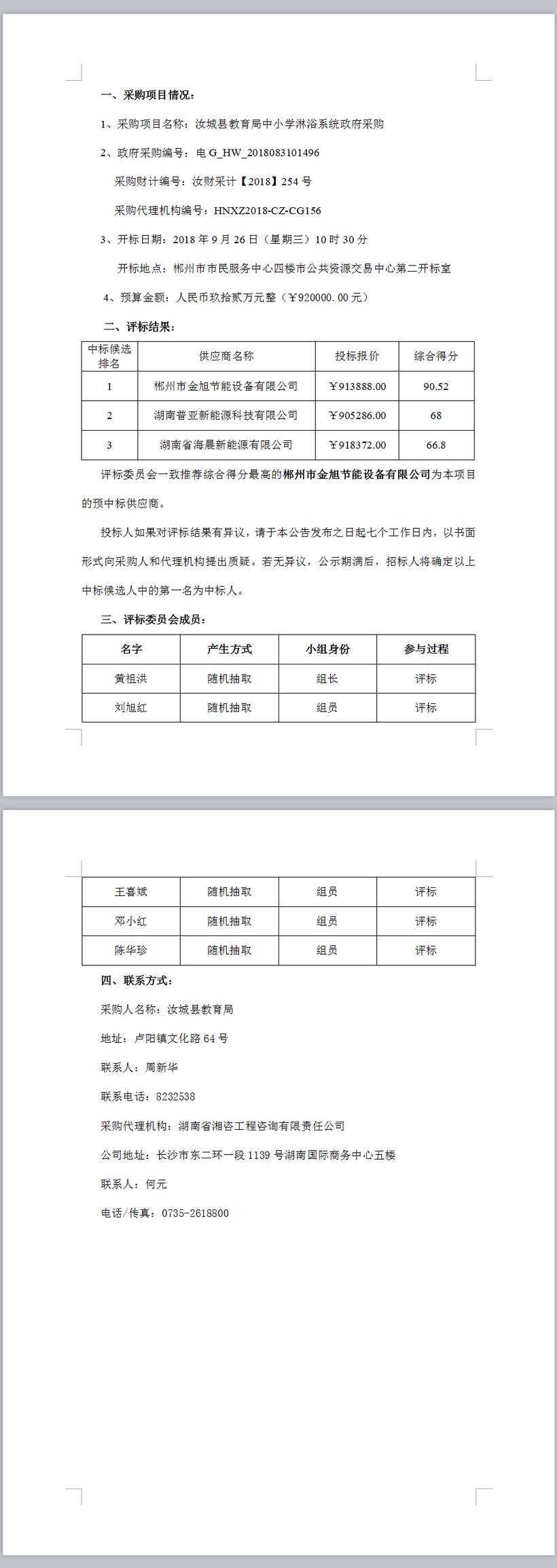 汝城縣教育局中小學淋浴系統政府采購中標結果公示