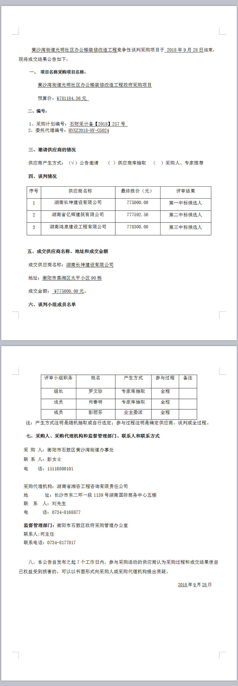 黃沙灣街道光明社區辦公樓裝修改造工程政府采購項目競爭性談判成交結果公告