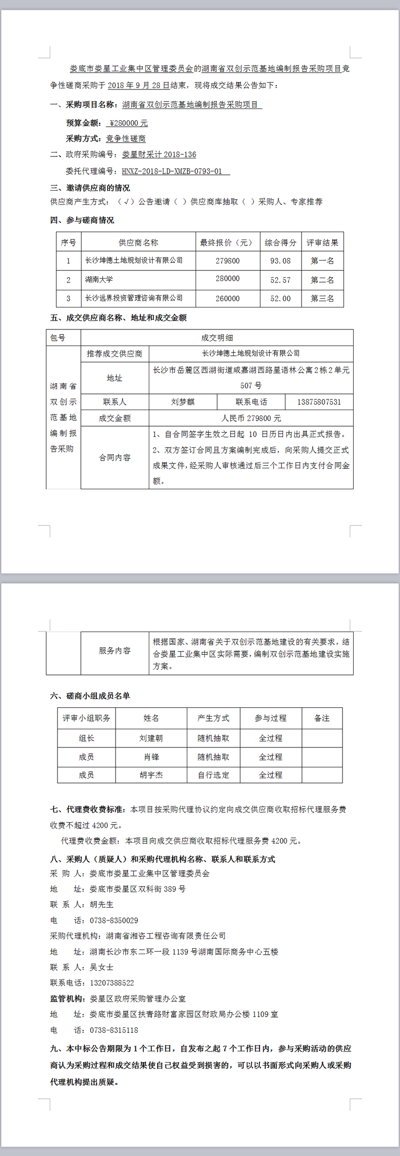 湖南省雙創示范基地編制報告采購項目競爭性磋商成交結果公告