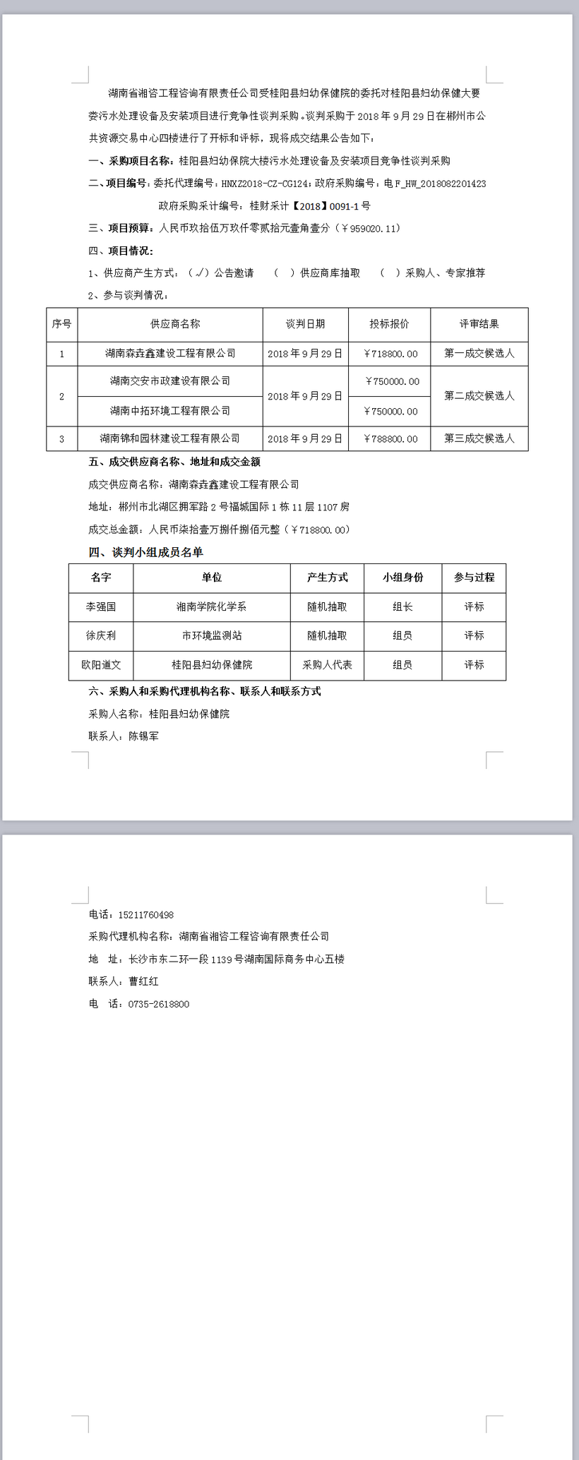 桂陽縣婦幼保健大樓污水處理設備及安裝項目競爭性談判采購成交公告