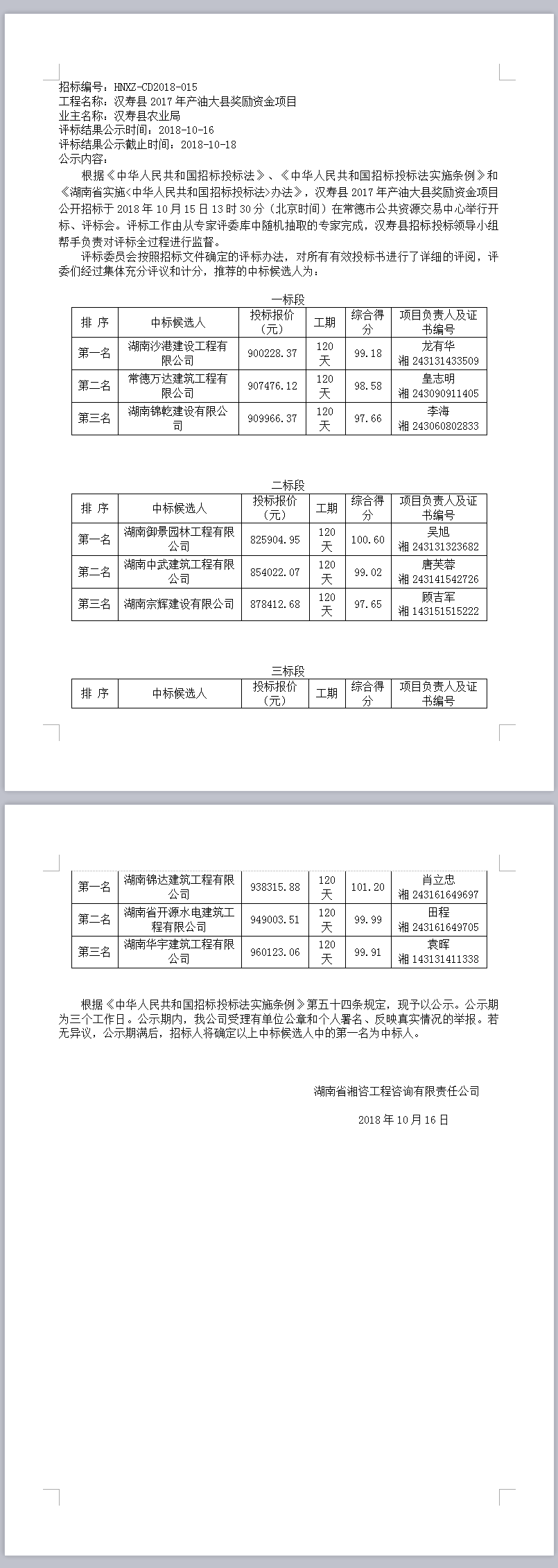 漢壽縣2017年產(chǎn)油大縣獎(jiǎng)勵(lì)資金項(xiàng)目中標(biāo)候選人公示