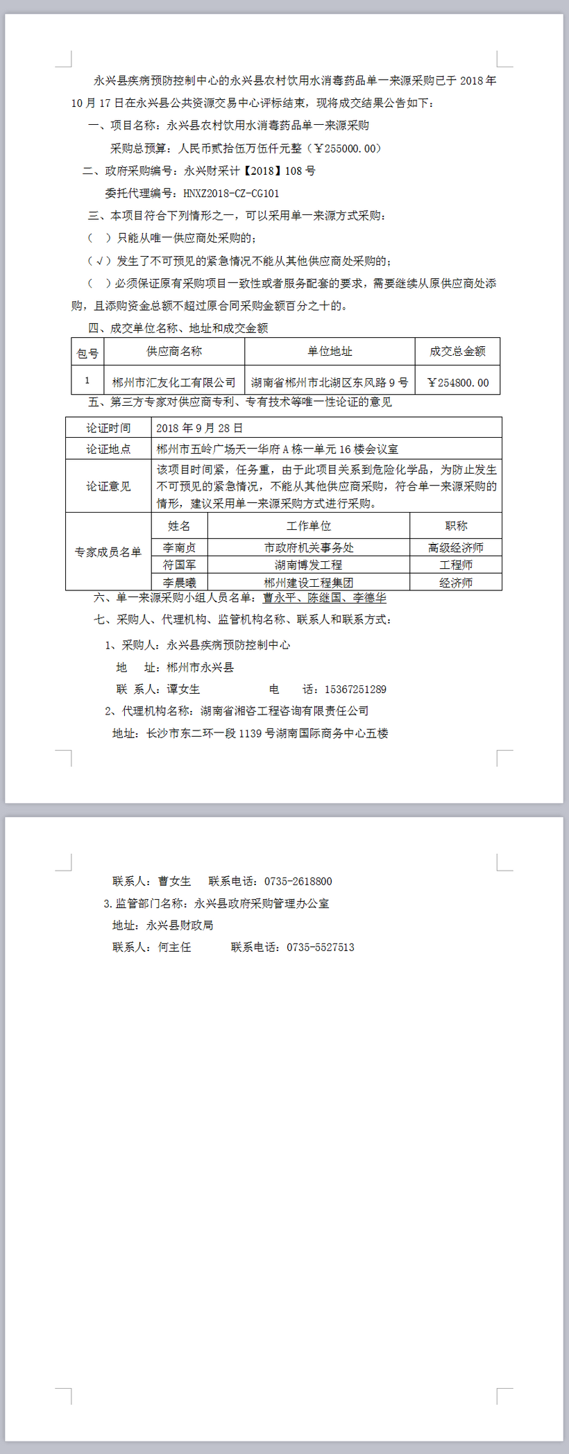 永興縣農村飲用水消毒藥品單一來源采購成交公告