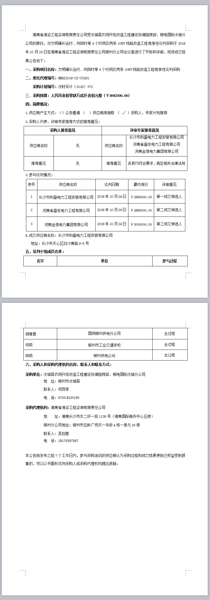 文明鎮長遠村、向陽村等4個村網及兩條10KV線路改造工程競爭性談判采購成交結果公告