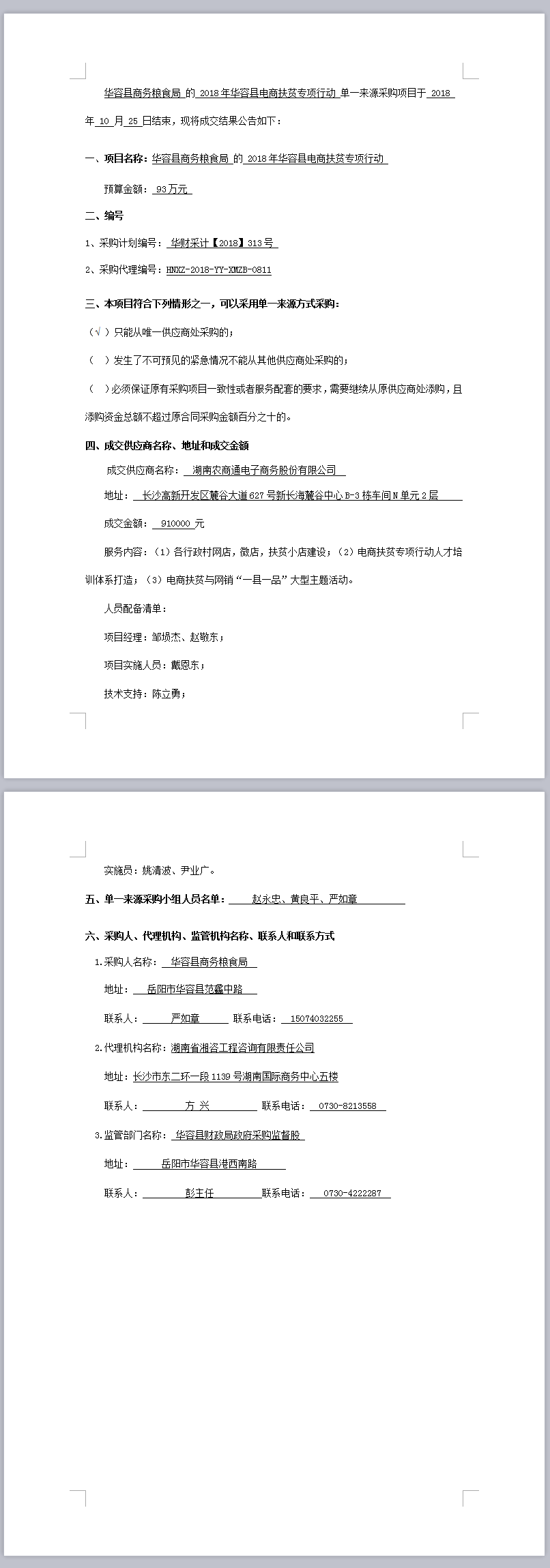 2018年華容縣電商扶貧專項行動 單一來源采購成交結果公告