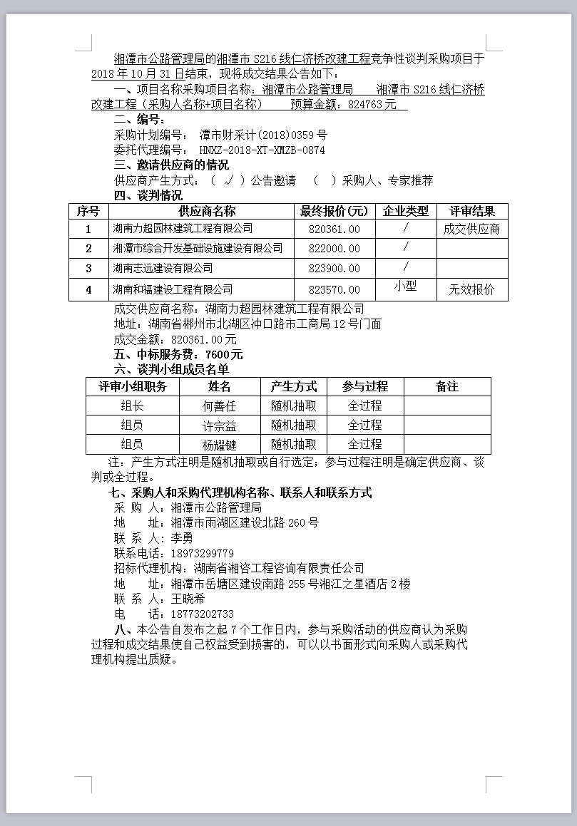 湘潭市S216線仁濟橋改建工程競爭性談判成交結(jié)果公告