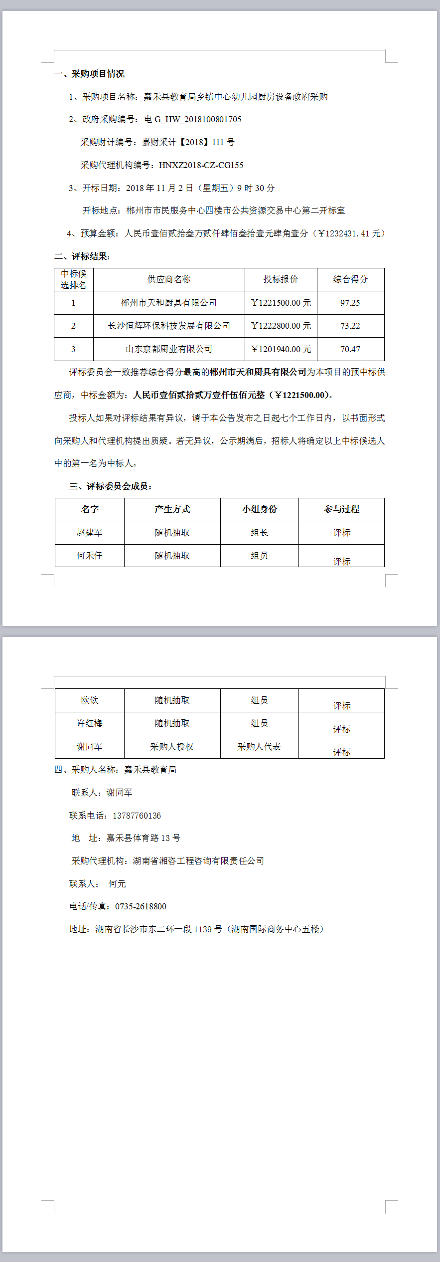 嘉禾縣教育局鄉(xiāng)鎮(zhèn)中心幼兒園廚房設(shè)備政府采購中標(biāo)結(jié)果公示