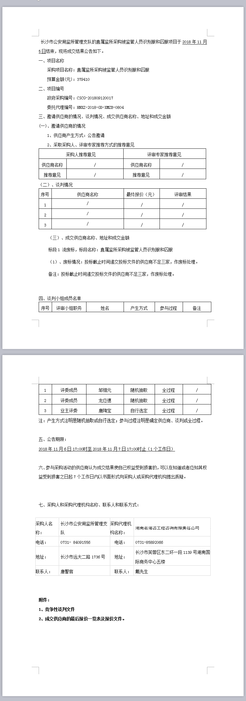 長沙市公安局監所管理支隊直屬監所采購被監管人員識別服和囚服結果公告