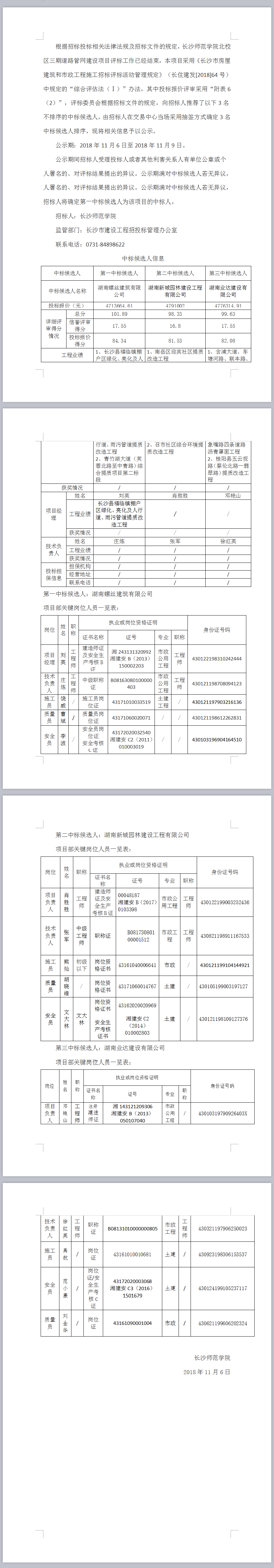 長沙師范學院北校區三期道路管網建設項目中標候選人公示