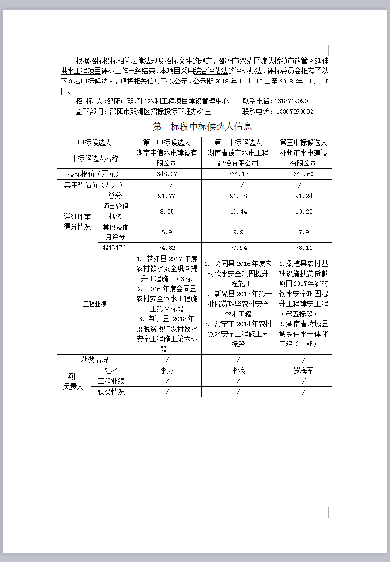 邵陽市雙清區渡頭橋鎮市政管網延伸供水工程項目 招標投標信息公示表