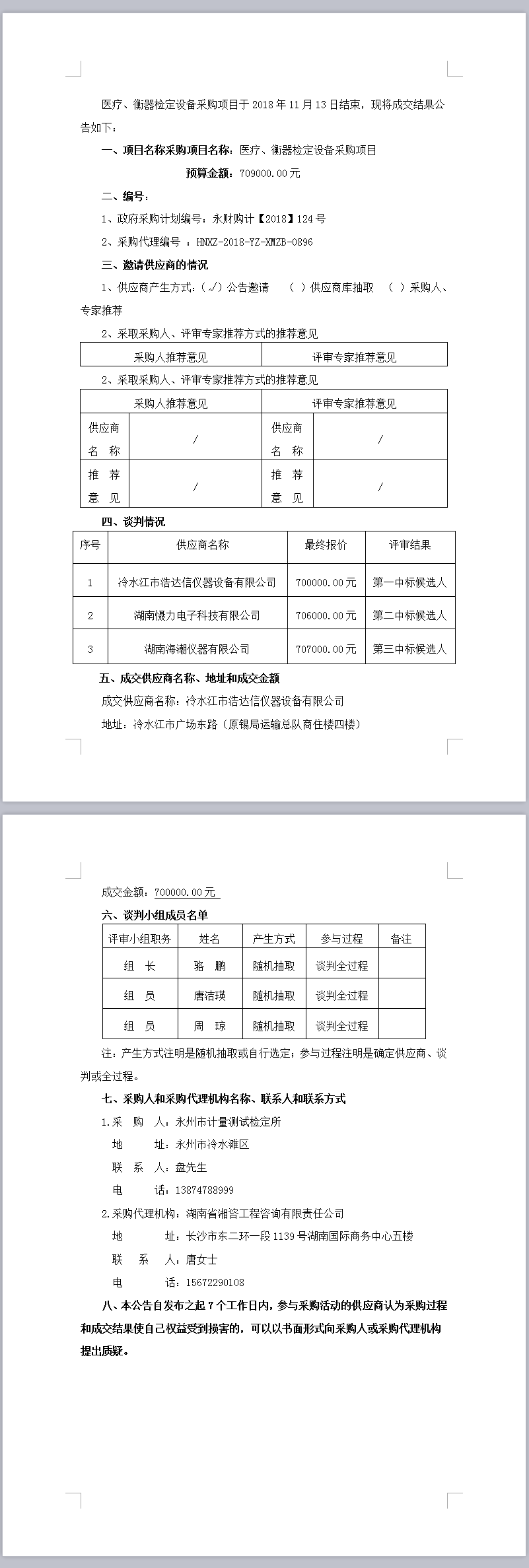 醫療、衡器檢定設備采購項目 競爭性談判成交結果公告