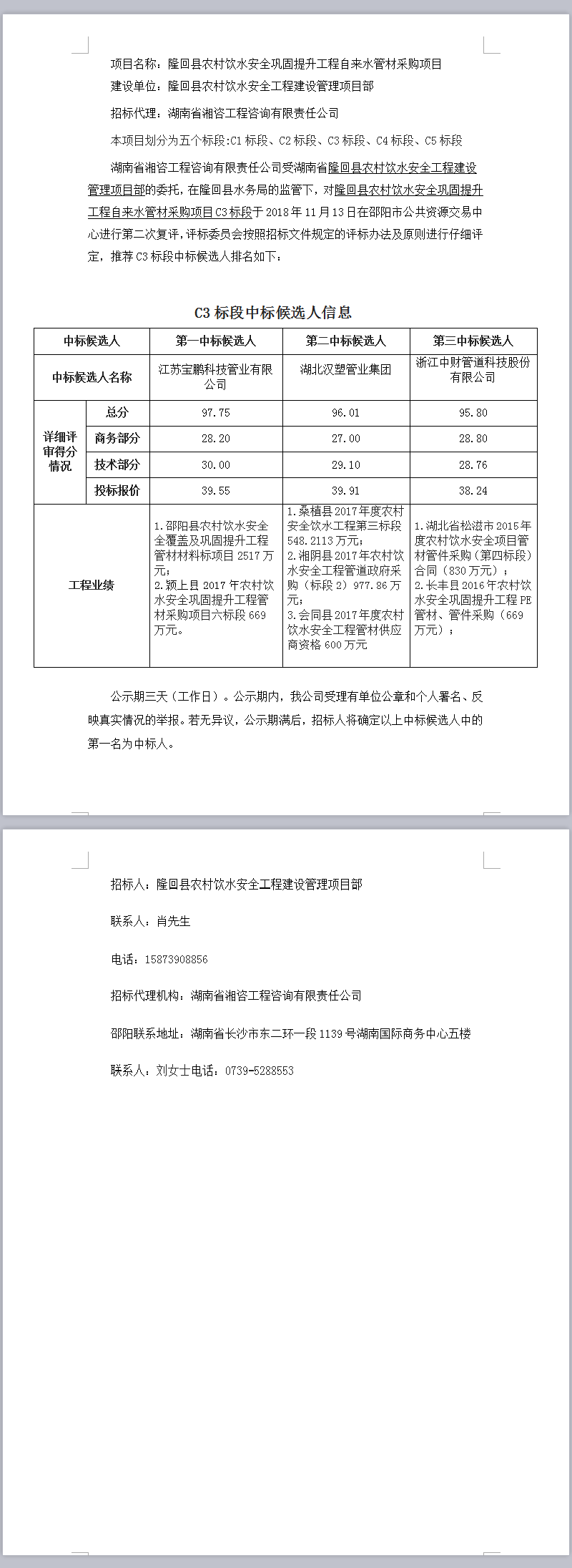 隆回縣農村飲水安全鞏固提升工程自來水管材采購項目C3標段招標投標信息公示表 (第二次復評)
