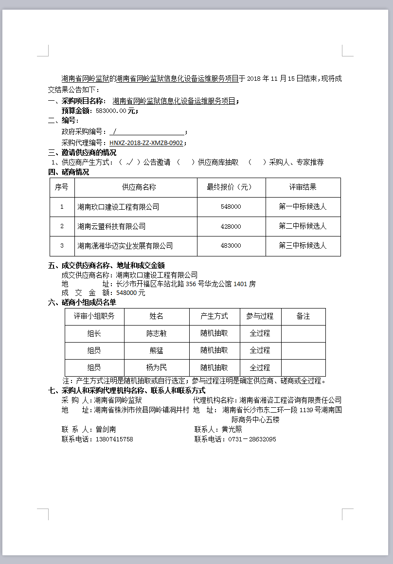 湖南省網嶺監獄信息化設備運維服務項目成交結果公告