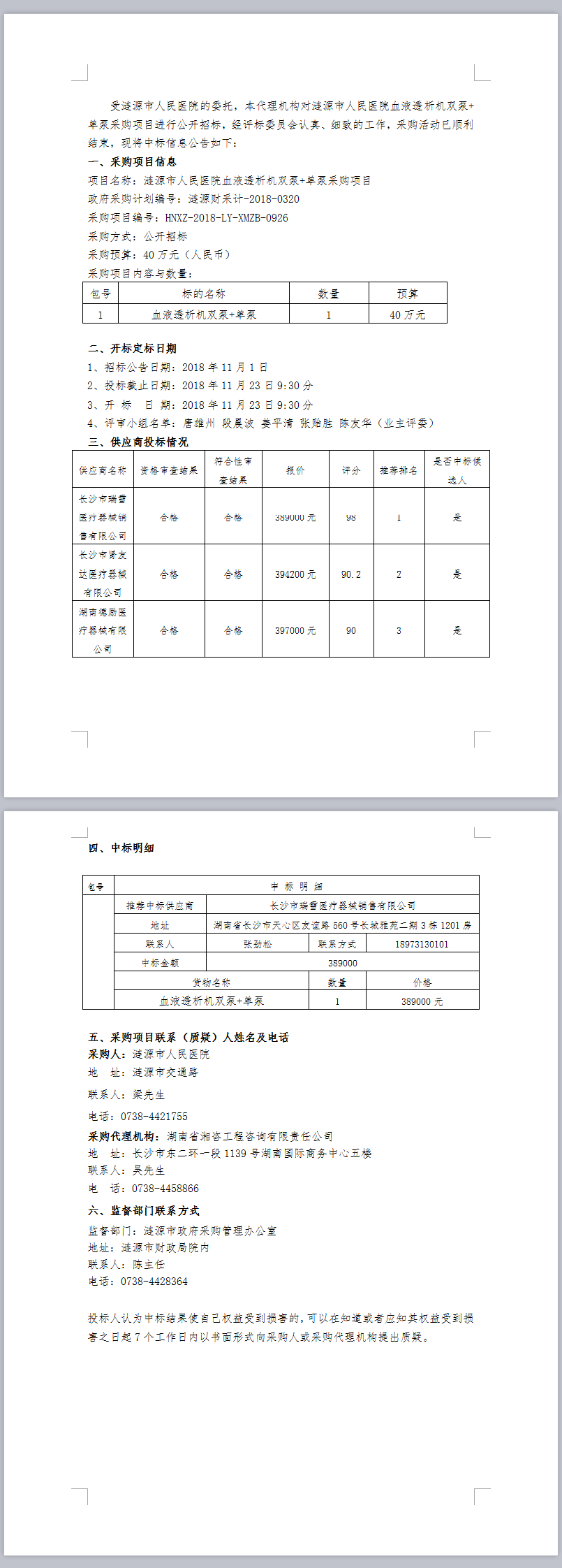 漣源市人民醫(yī)院血液透析機(jī)雙泵+單泵采購(gòu)項(xiàng)目中標(biāo)結(jié)果公告