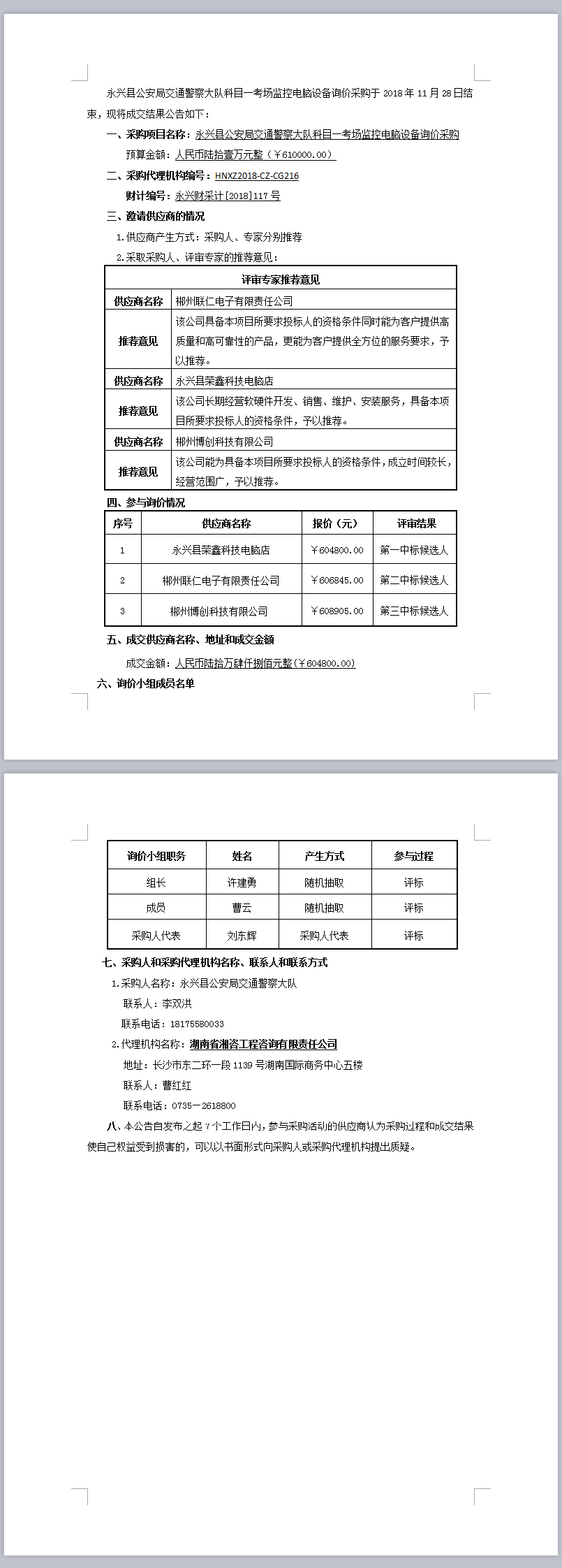 永興縣公安局交通警察大隊科目一考場監(jiān)控電腦設備詢價采購成交結果公告