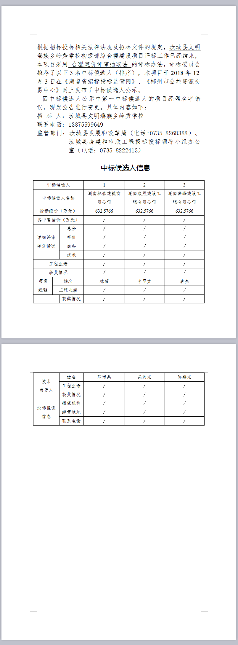 汝城縣文明瑤族鄉(xiāng)嶺秀學(xué)校初級部綜合樓建設(shè)項目中標(biāo)候選人公示(變更)
