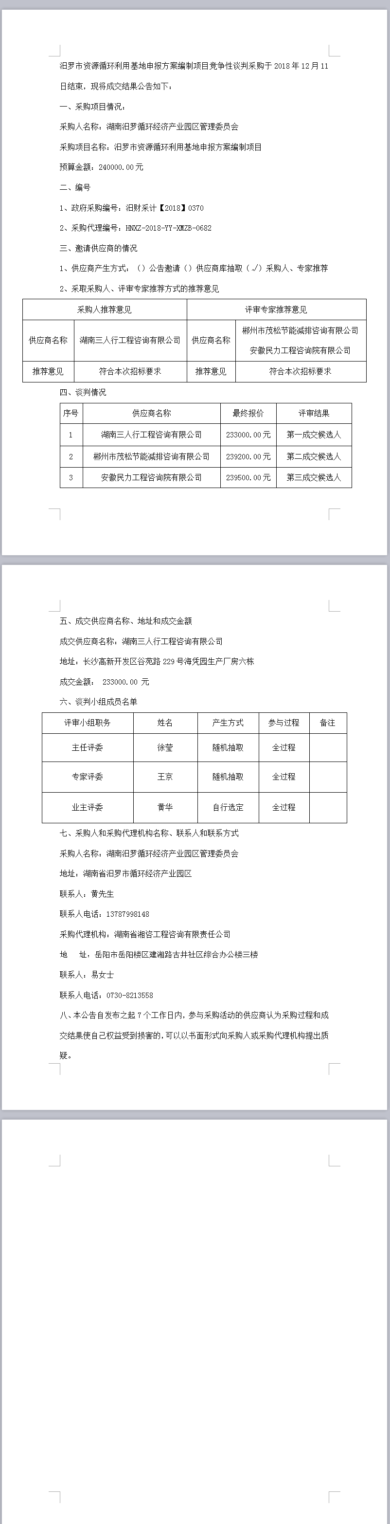 湖南汨羅循環經濟產業園區管理委員會競爭性談判成交結果公告