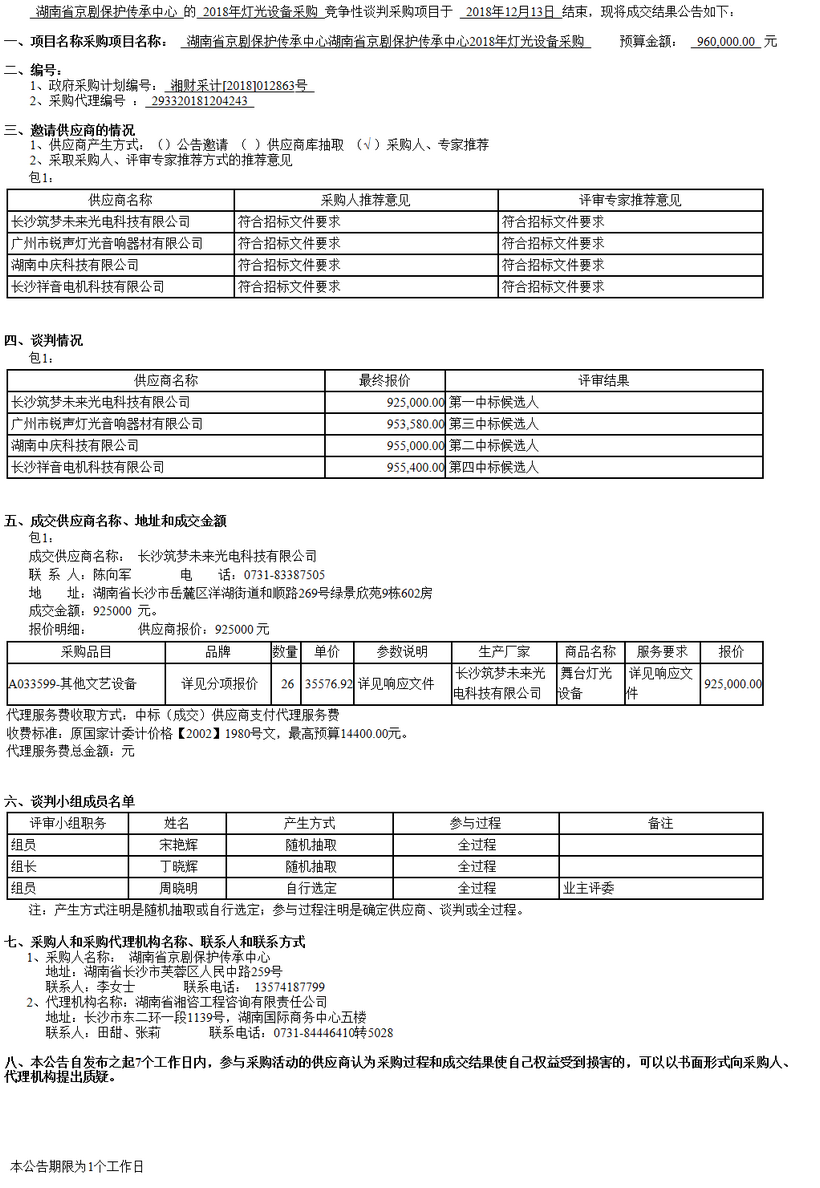 湖南省京劇保護傳承中心2018年燈光設備采購 競爭性談判成交公告