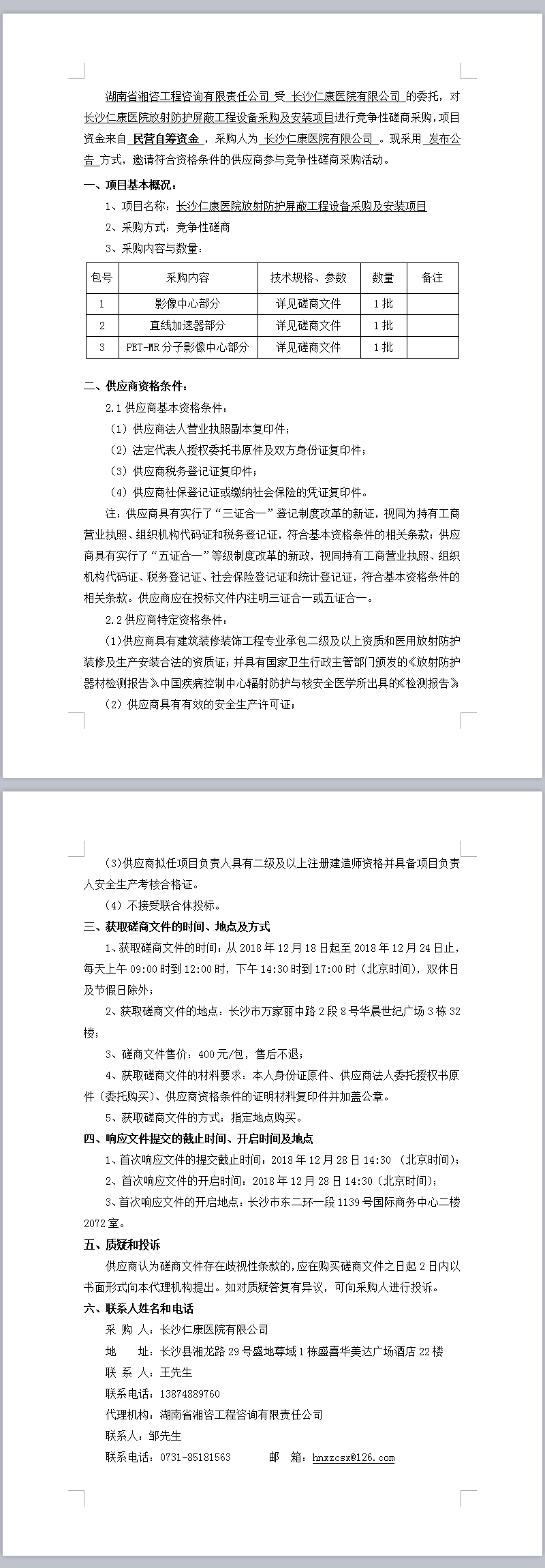 長沙仁康醫院放射防護屏蔽工程設備采購及安裝項目磋商邀請公告