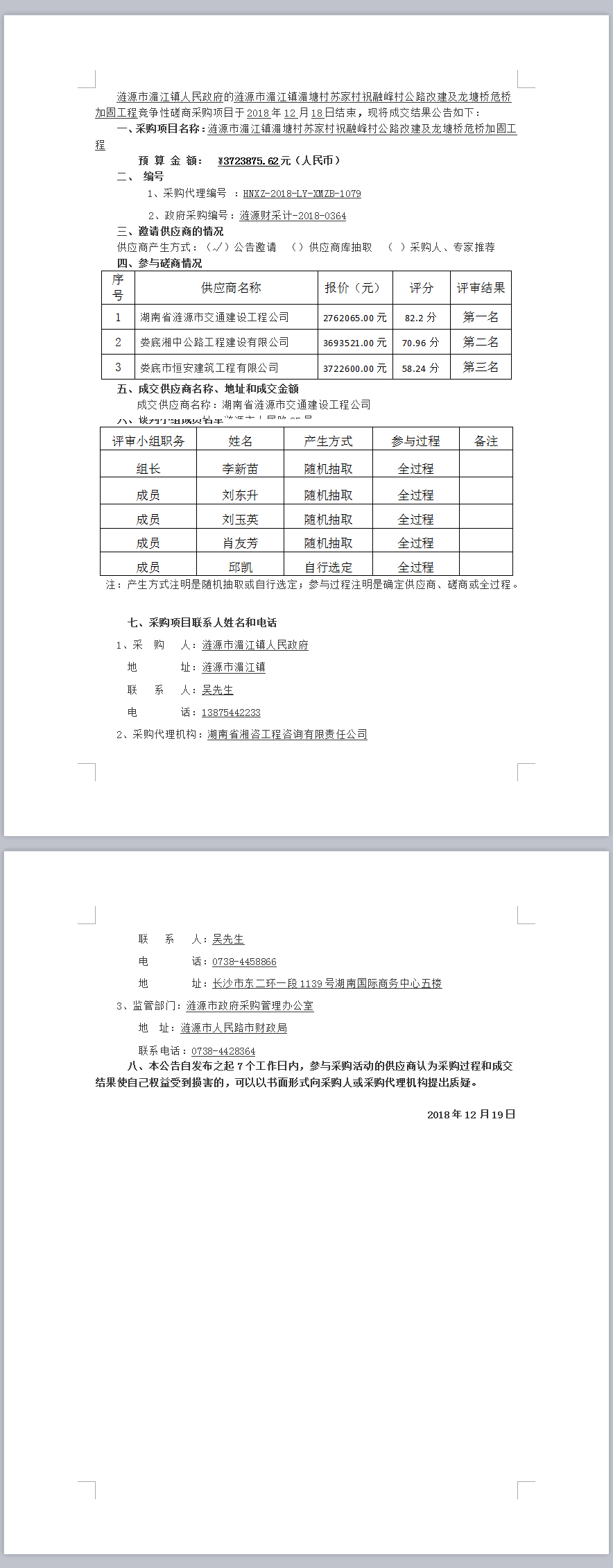 漣源市湄江鎮湄塘村蘇家村祝融峰村公路改建及龍塘橋危橋加固工程競爭性磋商成交結果公告