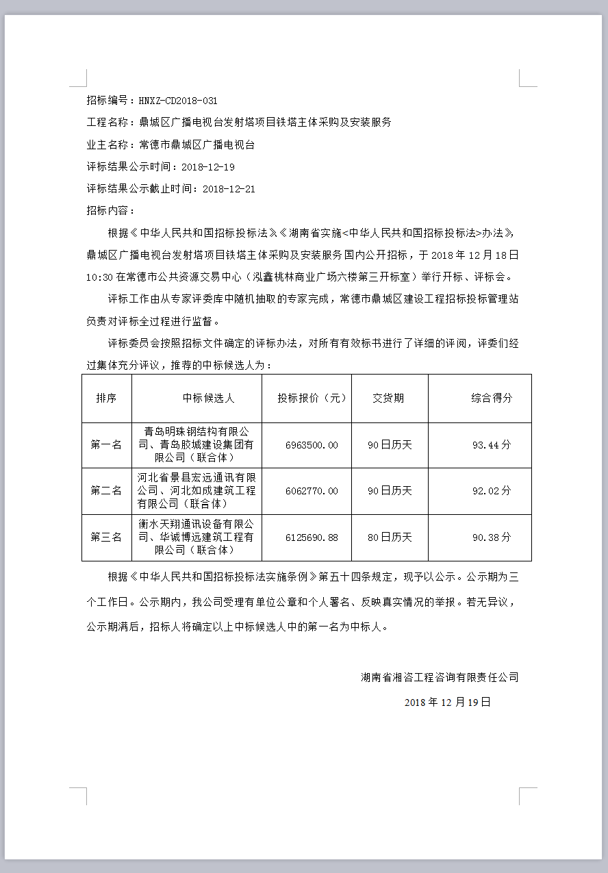 鼎城區(qū)廣播電視臺發(fā)射塔項目鐵塔主體采購及安裝服務(wù)中標候選人公示