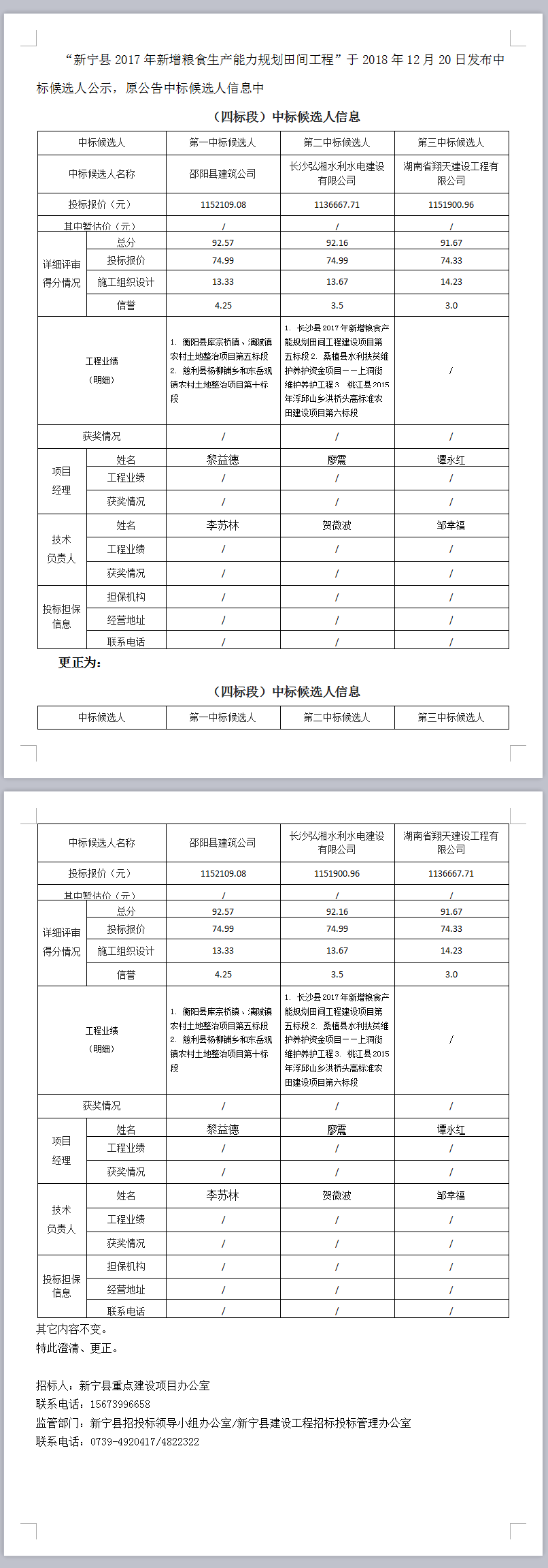 新寧縣2017年新增糧食生產(chǎn)能力規(guī)劃田間工程 中標候選人(澄清、更正)公示