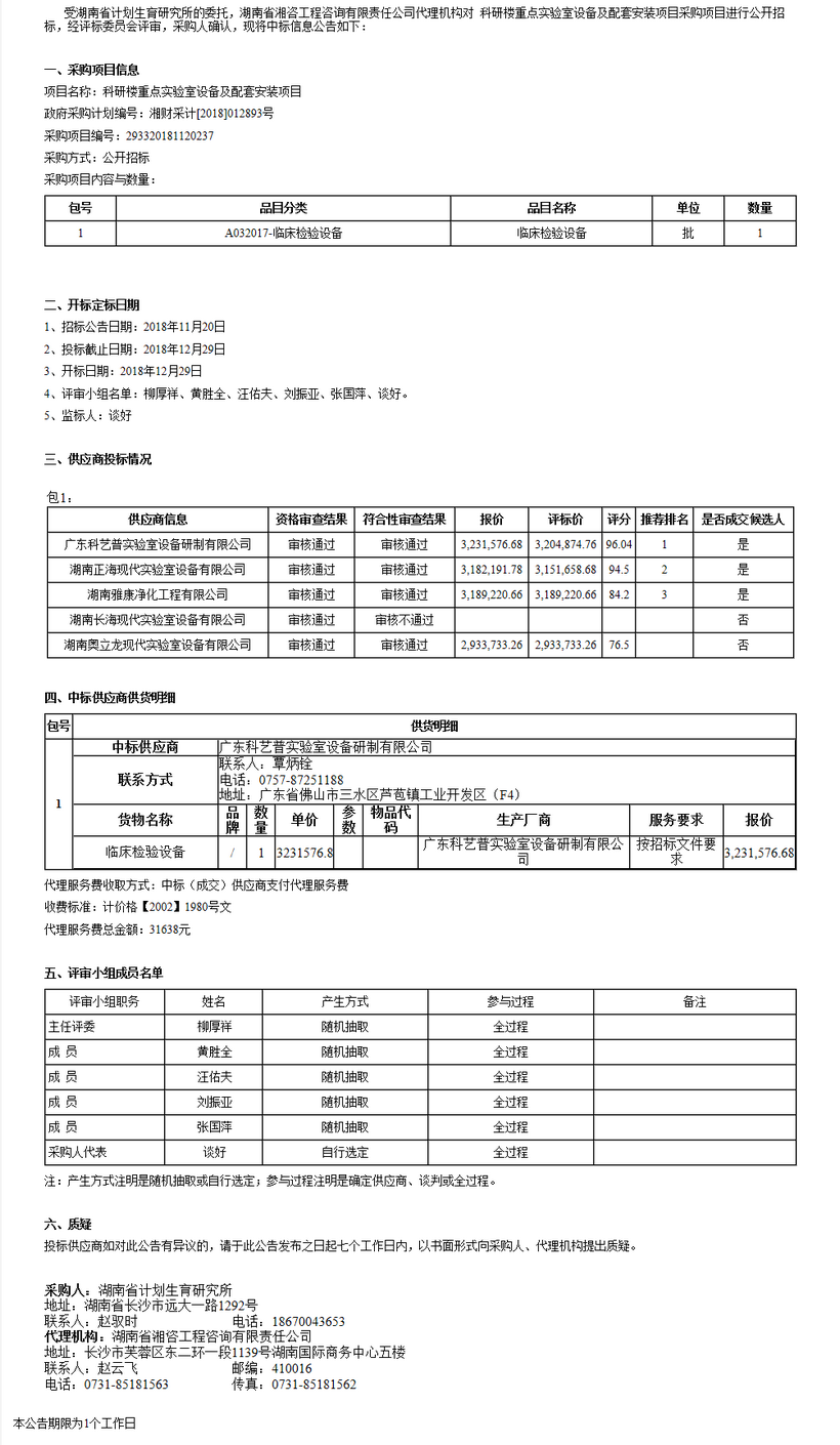 湖南省計劃生育研究所科研樓重點實驗室設備及配套安裝公開招標中標公告